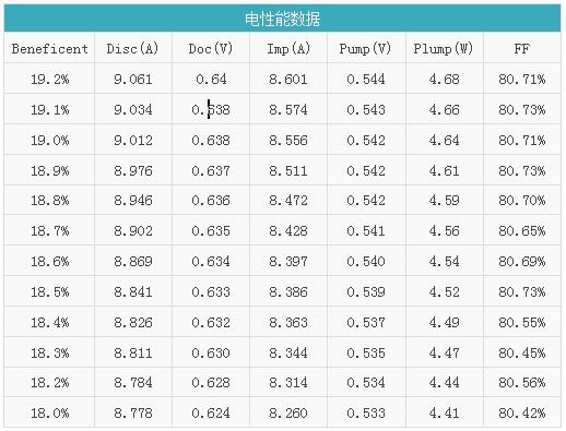 110根细栅线、带分流线正面电极设计;先进的MES系统保证了出货产品的可追溯性;采用SPC系统进行生产工艺参数的控制, 全自动化生产线保证了产品质量的稳定性和均一性;100%电池外观全检(采用外观检测模块和二次人眼确认);完全抗PID(普通EVA即可通过PID测试96小时);严格的浆料评估程序确保产品通过欧盟的Rohs&Reach标准;优化的包装设计确保运输中的最低的碎片率.
