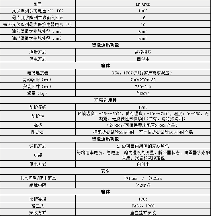 可增设监控,预装并也适应于现有改造升级。监控每路组串电流,总电压,箱内温度的测量,断路器状态,防雷器状态的采集,报警和故障定位。